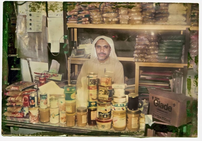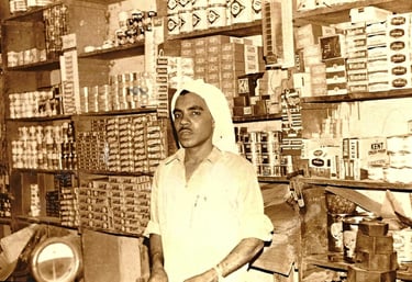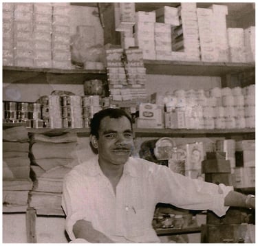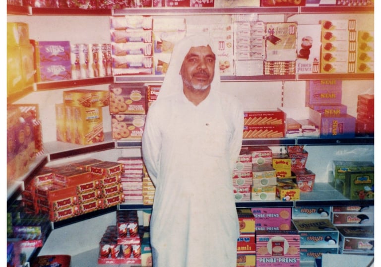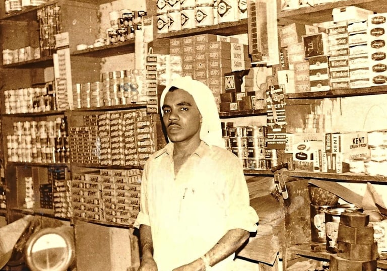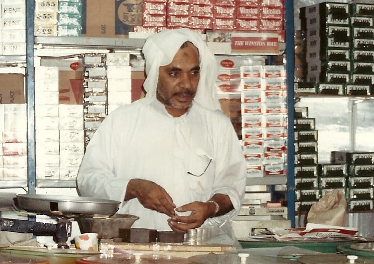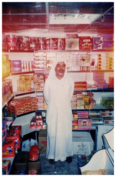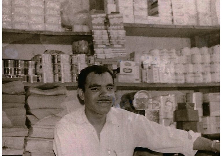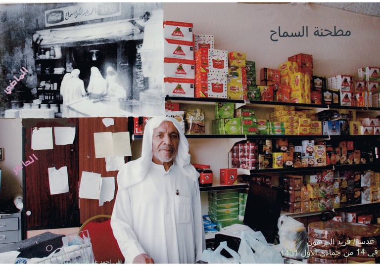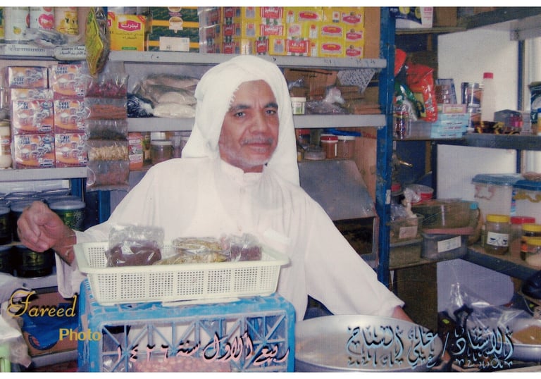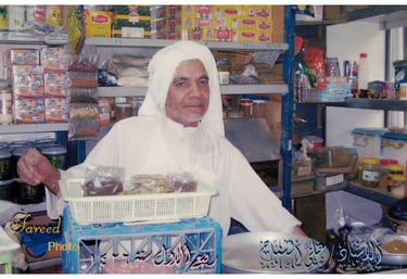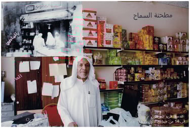 الوالد الحاج علي آل سماح يقف في محل المسكرات الذي تم فتحه بعد مكان مكانه المكتبة وهي مكتبة السماح