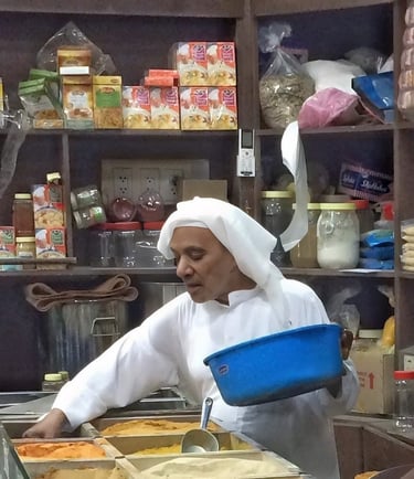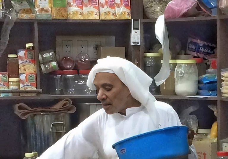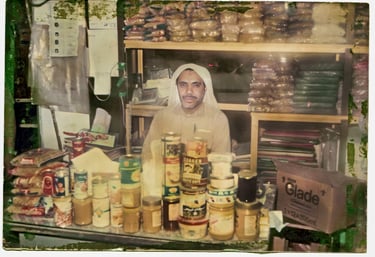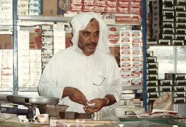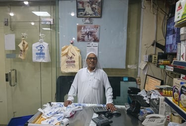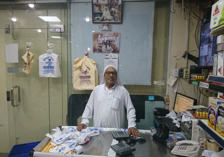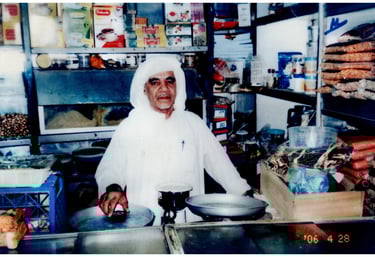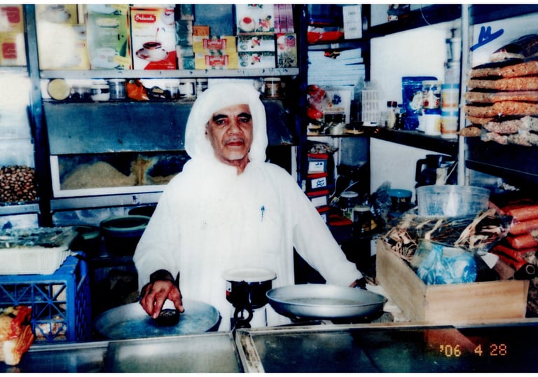 الوالد يقف في المحل وفي يده أداة الوزن القديمة التي لم تعد تستخدم الان